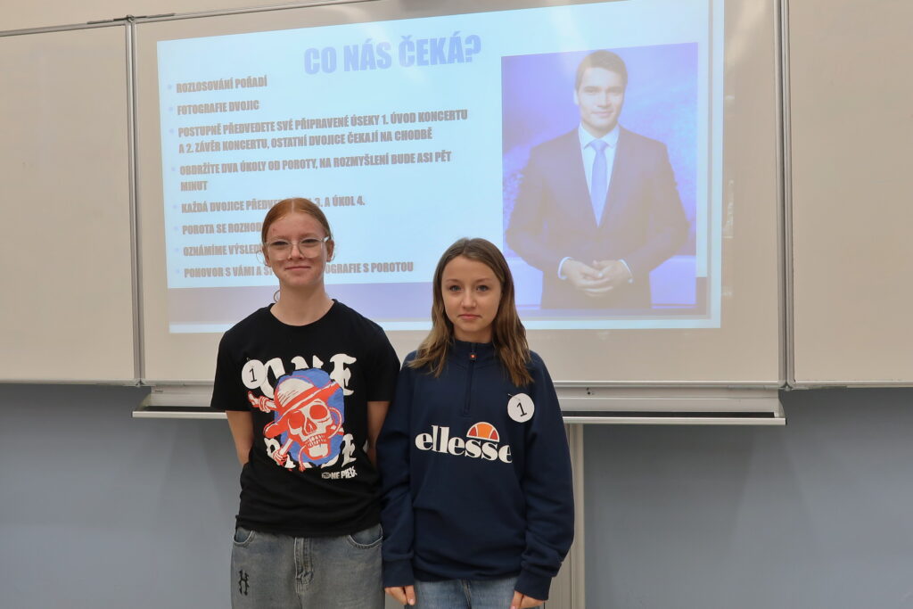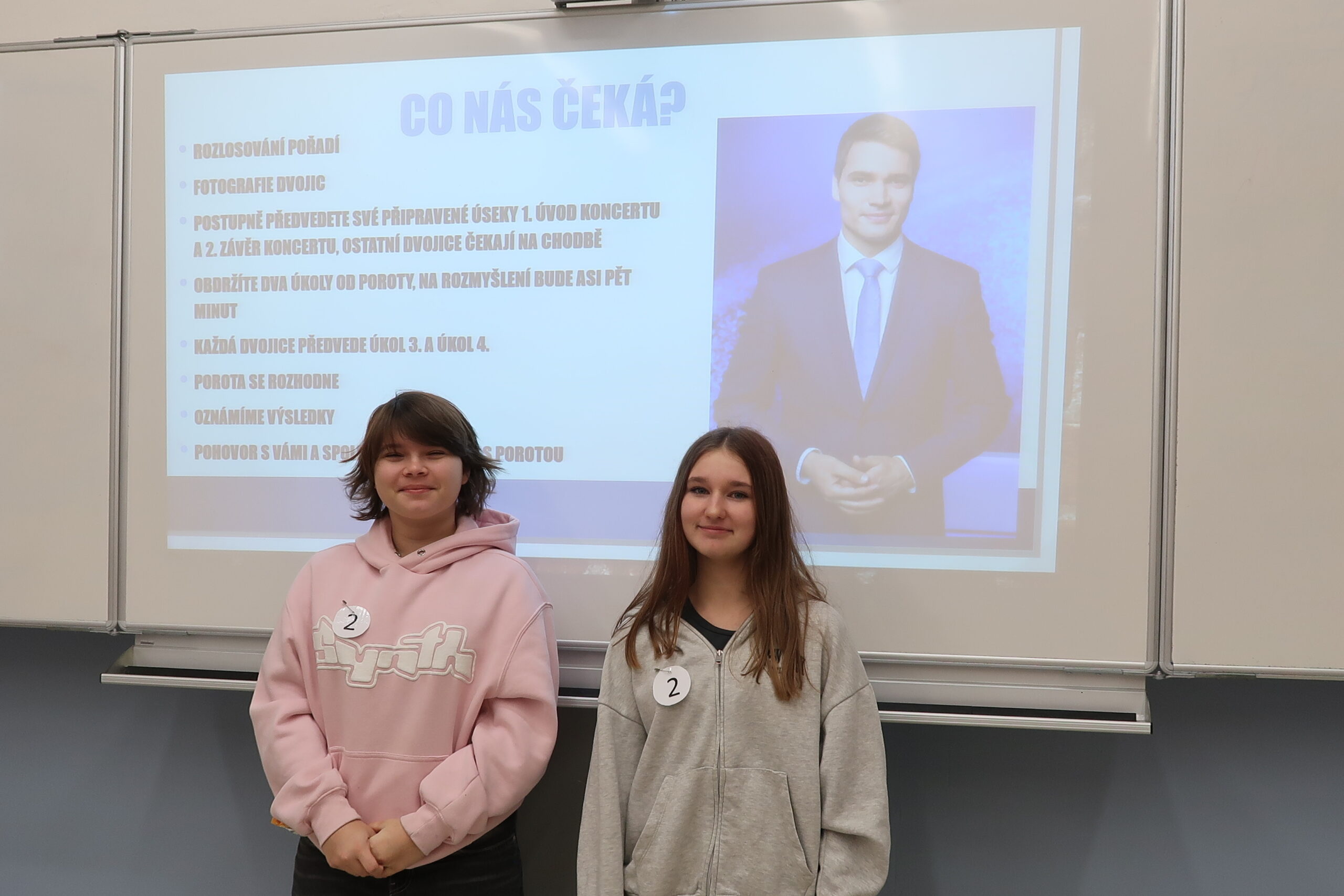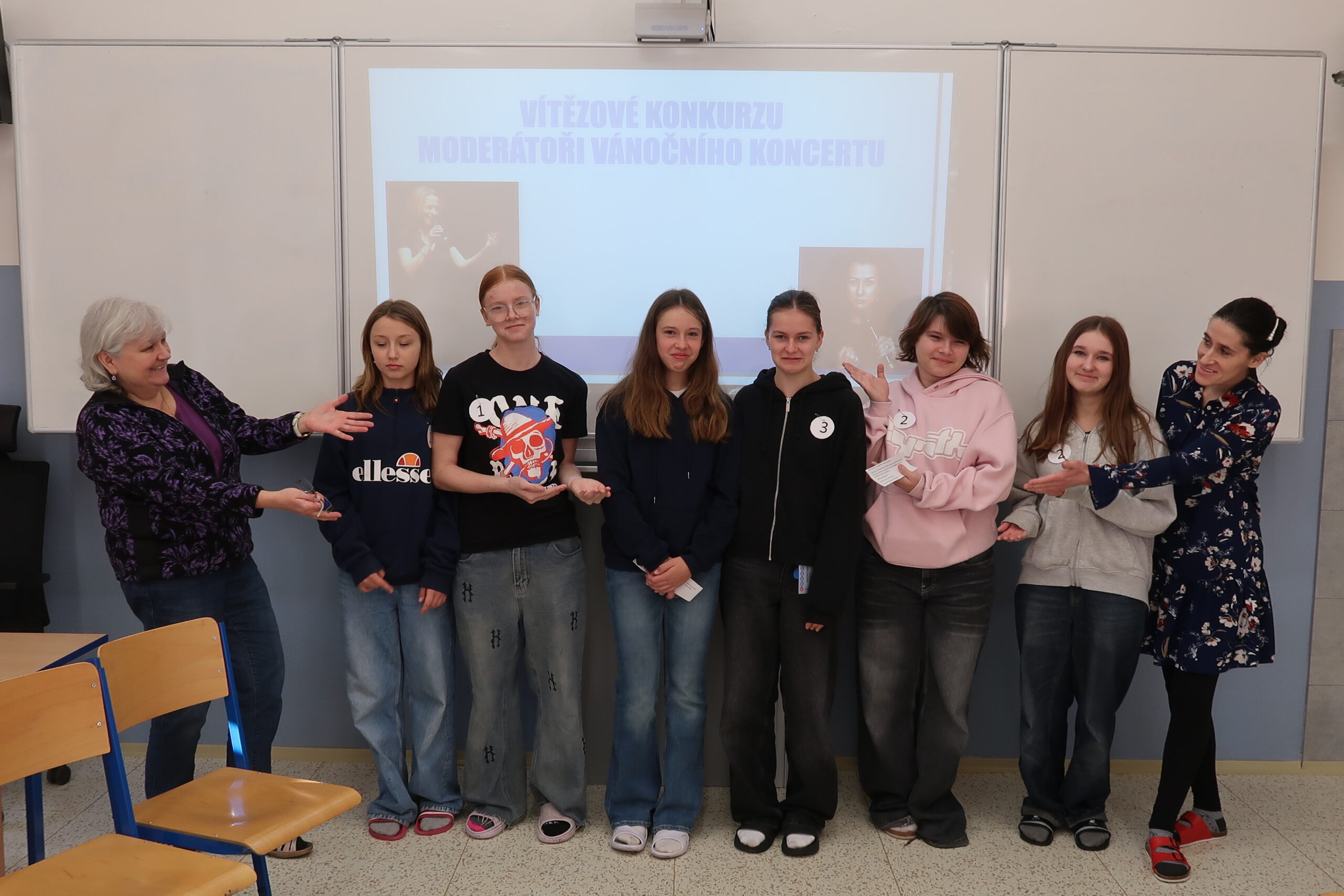 Dnes se rozhodovalo o tom, kdo bude uvádět zimní koncert. Přihlásily se tři dvojice žákyň z osmých ročníků. Pochvalu zaslouží všechny odvážné slečny – Eliška, Sarah, Natálie, Adéla, Zuzana i Sofie. Dívky plnily různé úkoly, některé si předem připravily doma, jiné jim vybrala komise na místě.