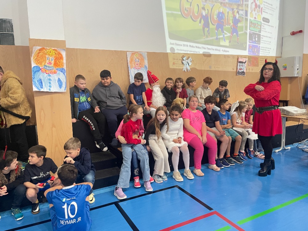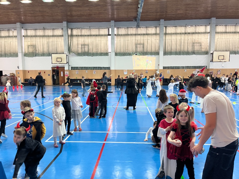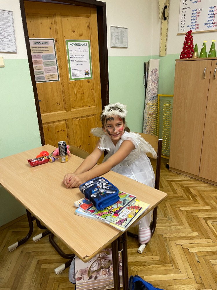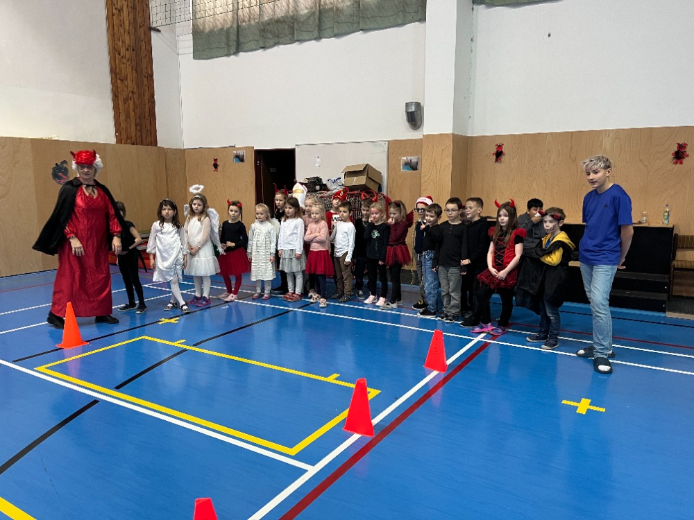 Novinkou bylo promítání just dance z projektoru, za jehož instalaci děkujeme panu učiteli Kapitánovi, protože písničky na stěně měly největší úspěch. Skvělý den pro malé čertíky a andílky skončil sladkou odměnou.