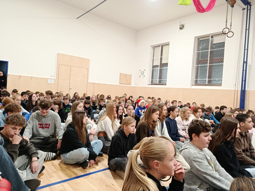 V úvodu popřál pan ředitel krásné svátky všem přítomným. Zároveň zazněl příslib lákavých nabídek na aktivní využití volného času při přestávkách. Má to ale jeden háček: Žáci musí dlouhodobě převzít zodpovědnost za dobré zacházení s novými pomůckami a také musí krotit své chování a vyjadřování v okolí školy, zejména na hřišti před a po vyučování.