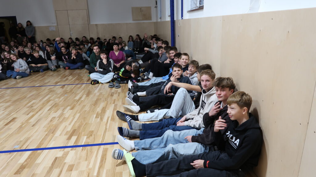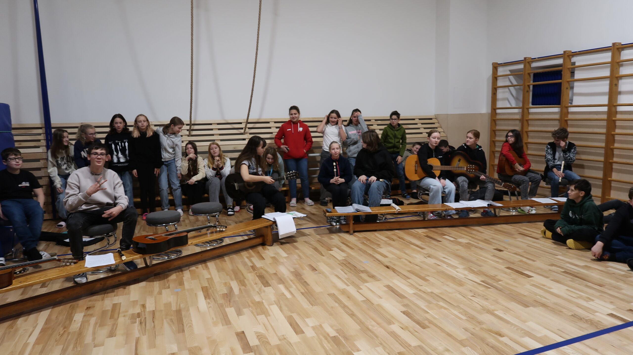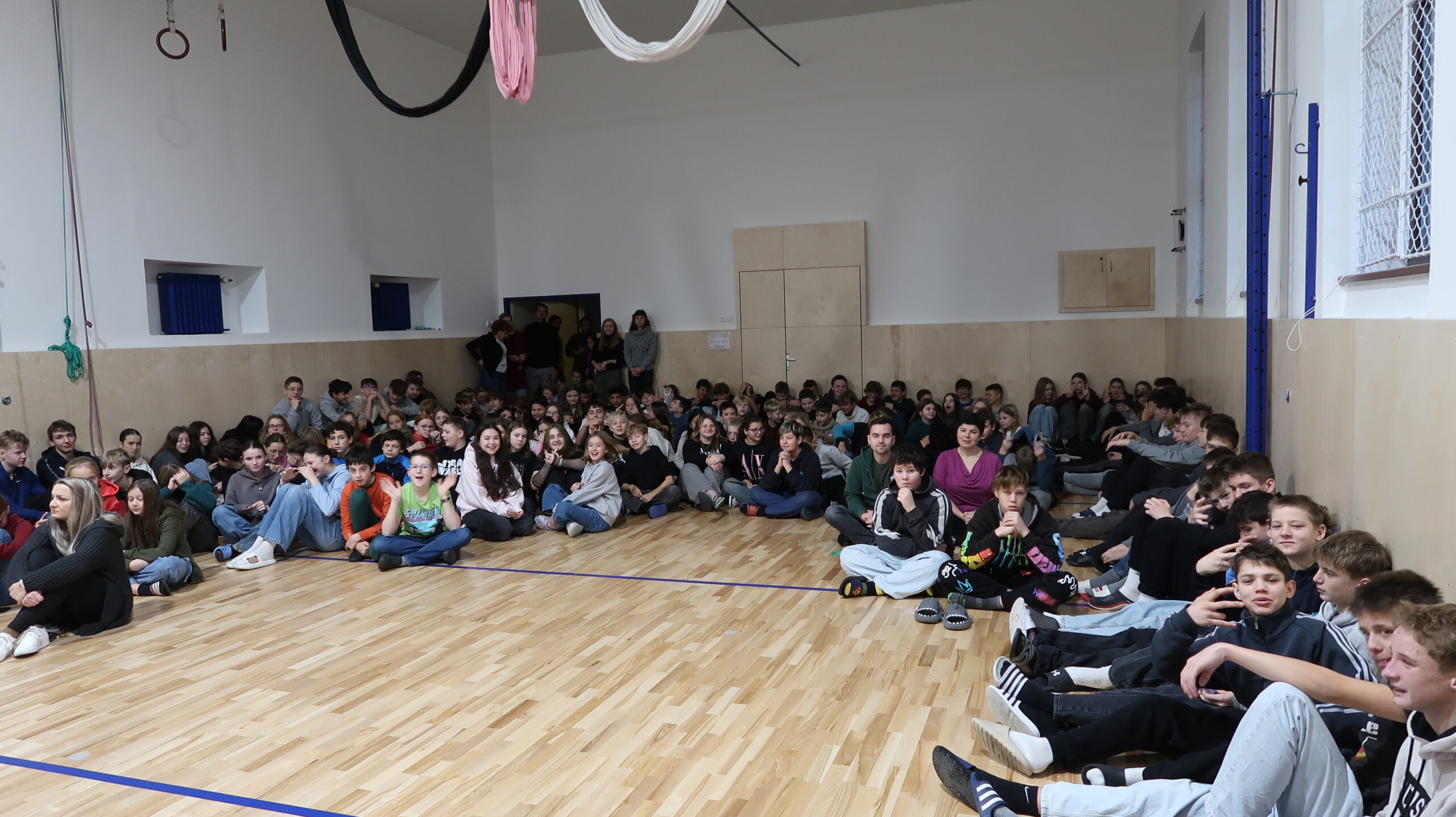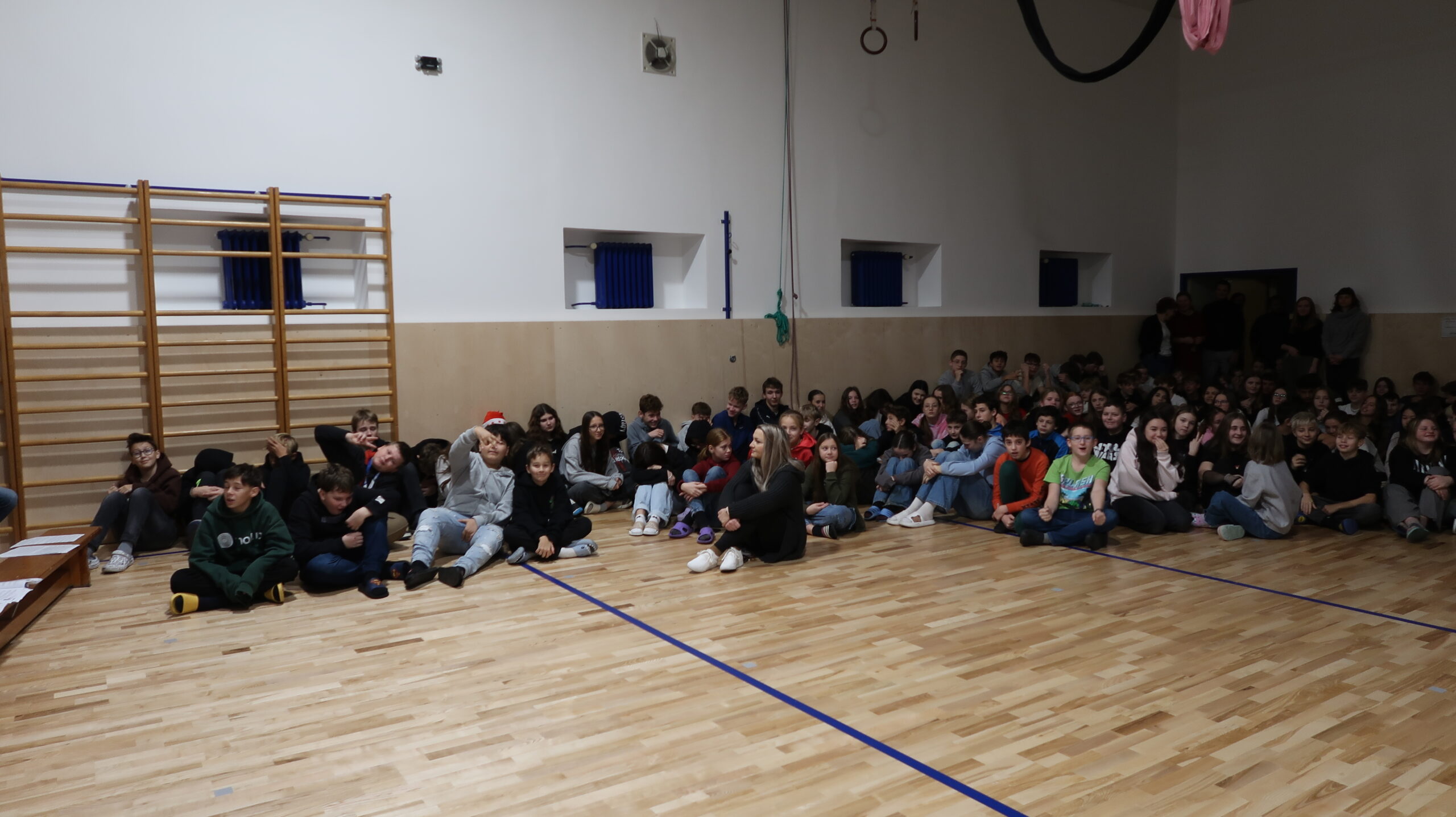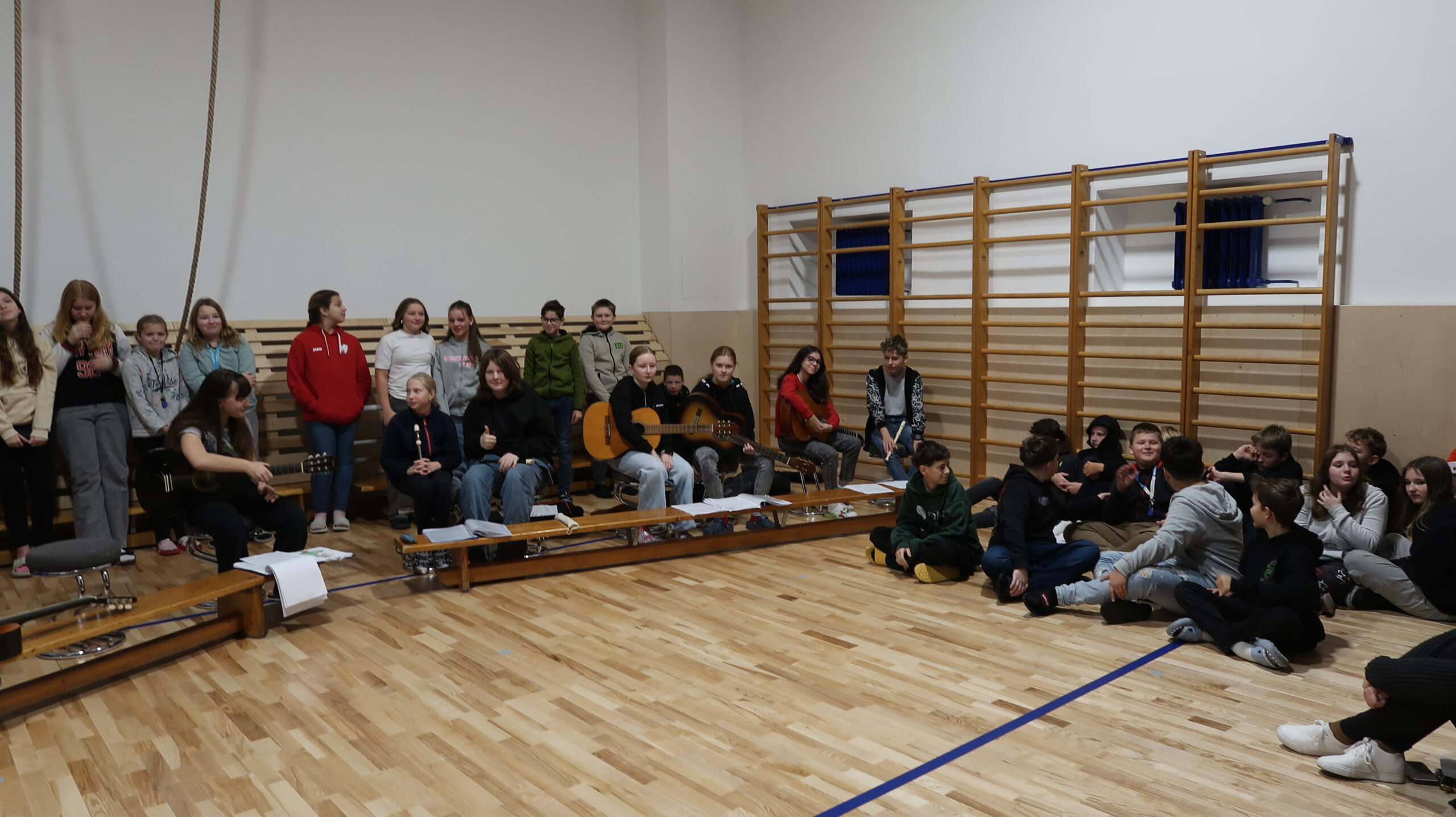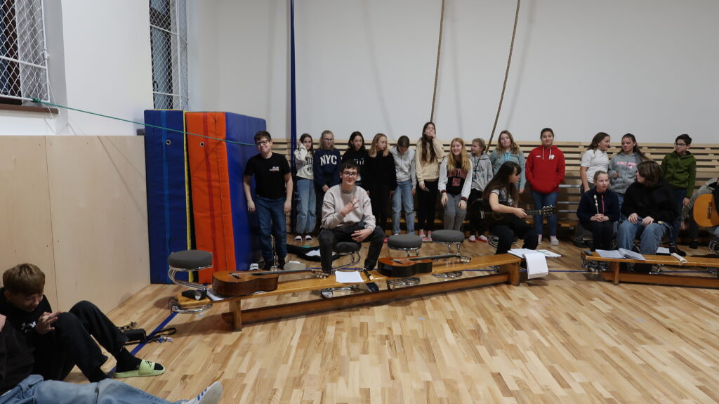 V pondělí po třetí adventní neděli jsme se na chvíli sešli všichni ze druhého stupně v malé tělocvičně. Tady už čekali členové hudebního kroužku Simča, Jordan, Eliška, Lucka, Terka, Tamča, Viki a Vojta.