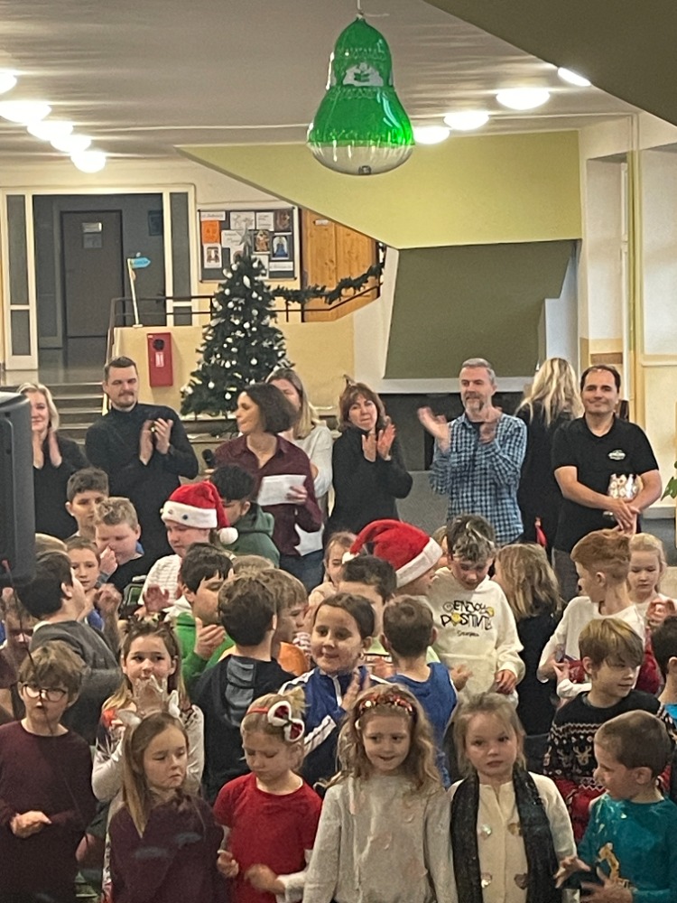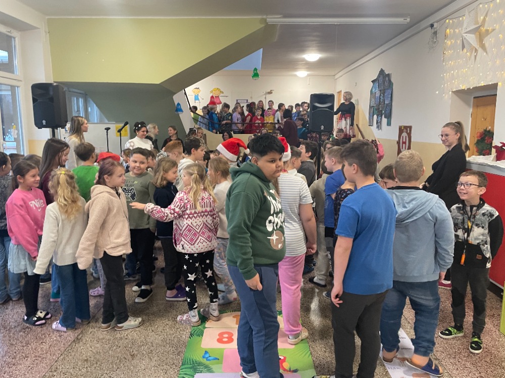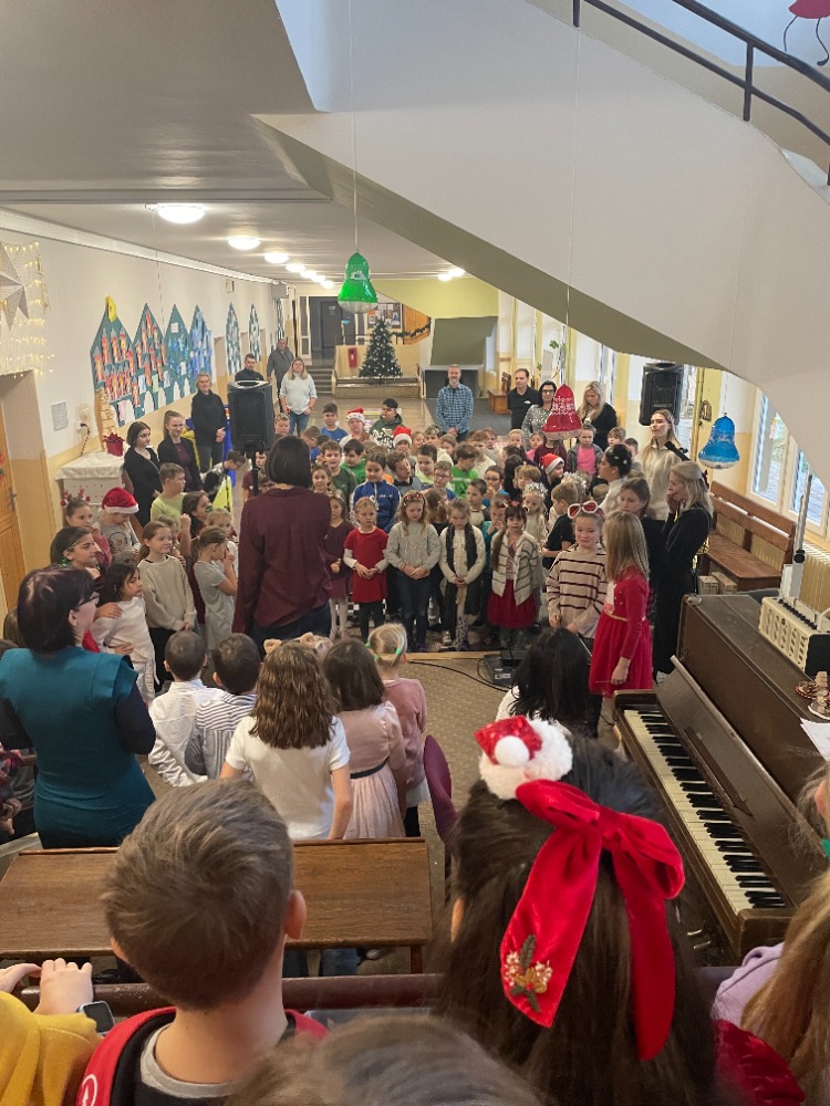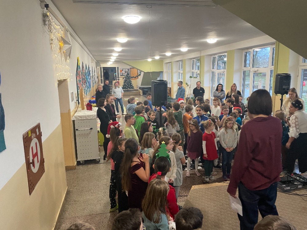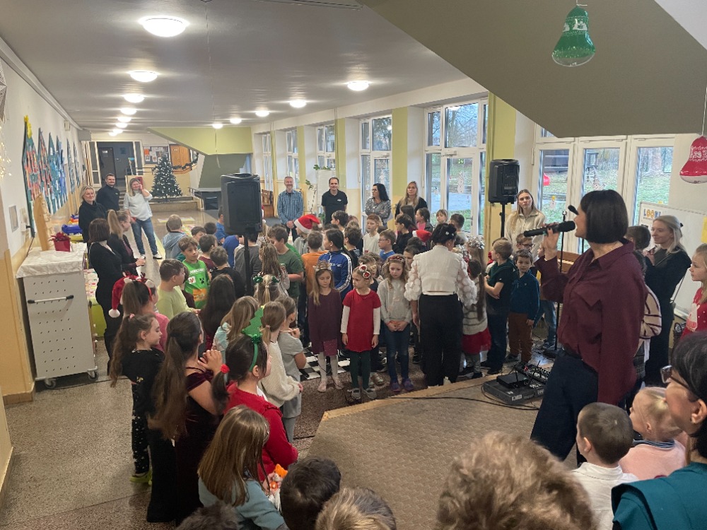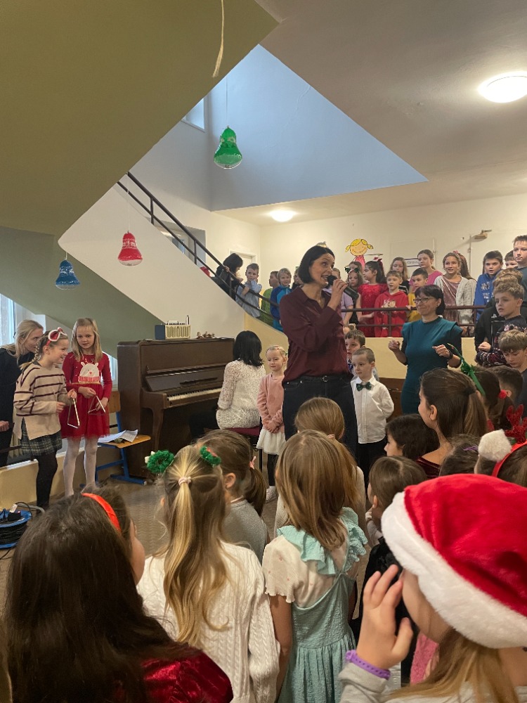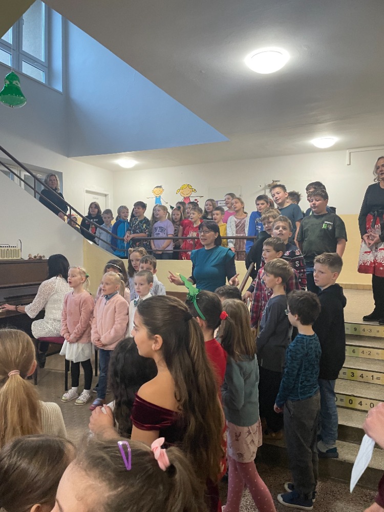 V pátek jsme pak všichni společně zazpívali vedení školy a dalším divákům nacvičené koledy a vánoční písničky za skvělého doprovodu paní učitelky Zahradníčkové na klavír a kytaru. Některé děti také doplňovaly zpěv na hudební nástroje. Sólo na flétničku předvedla žákyně ze 4.třídy Lucka Kulhánková.