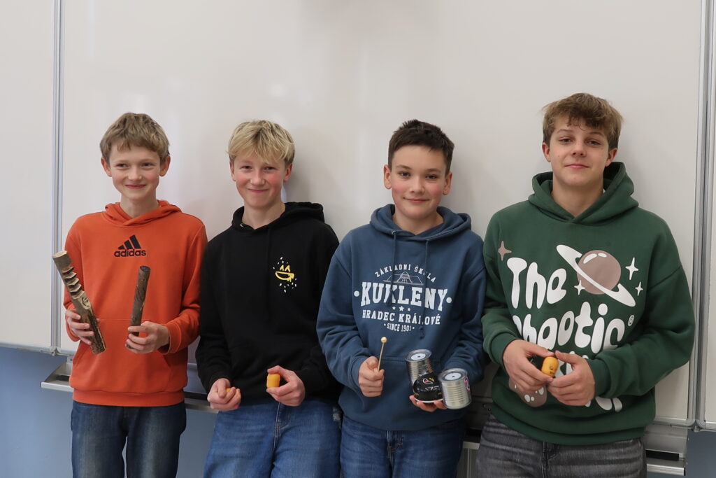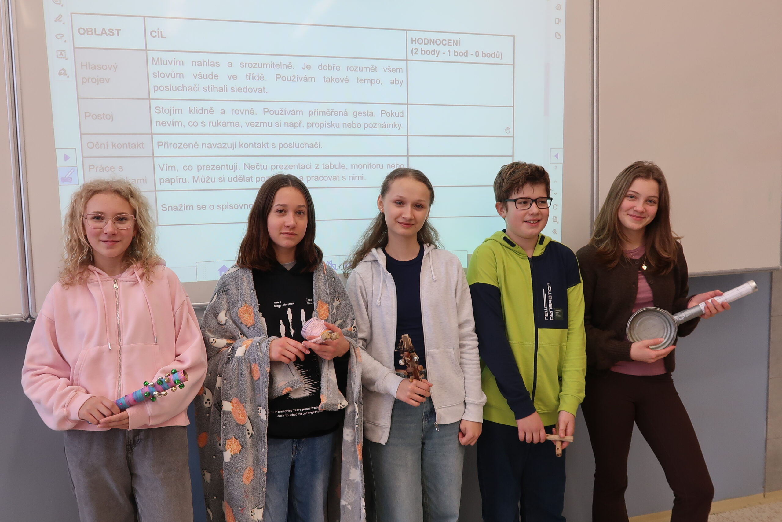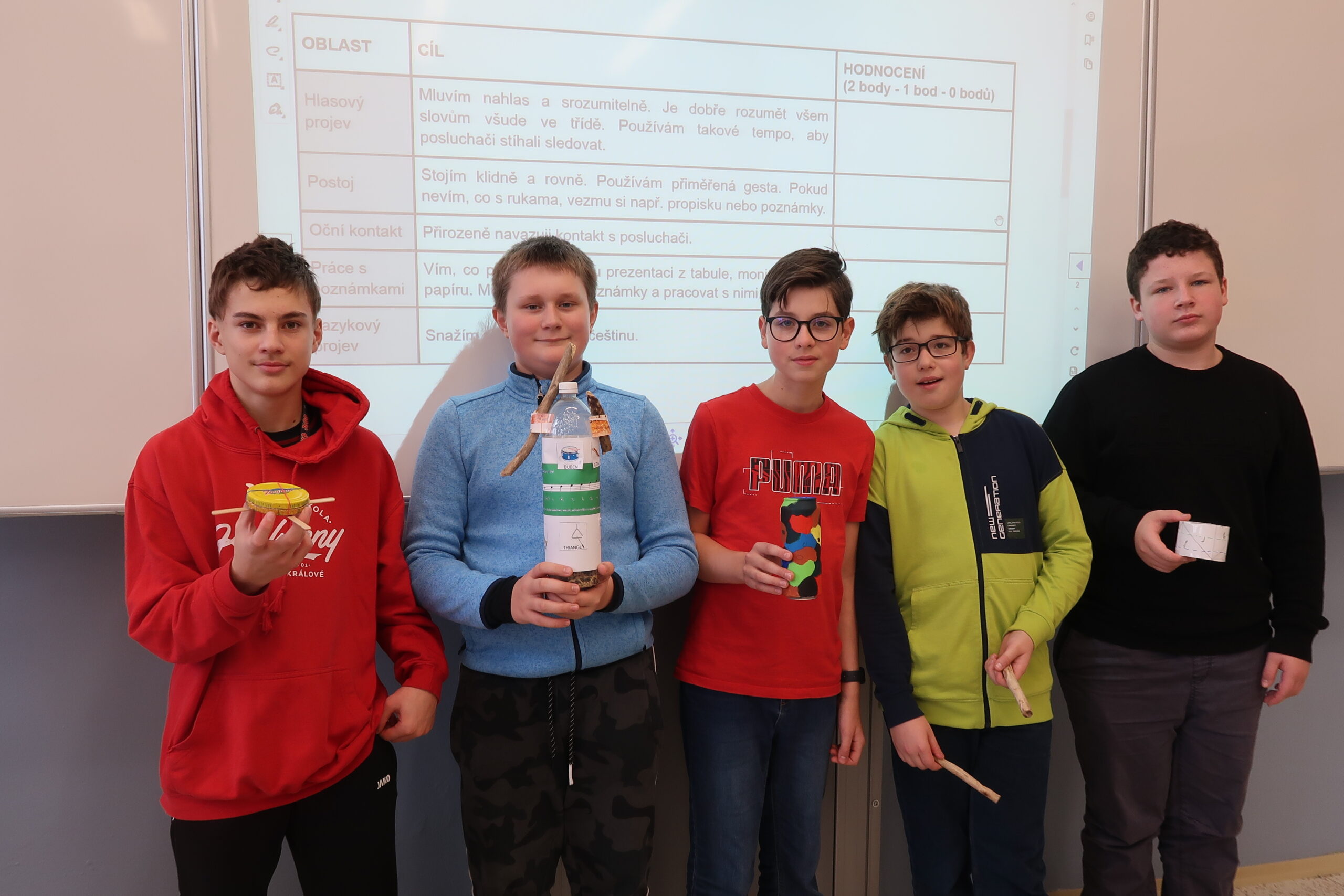 Závěrečné hodnocení prezentací bylo převážně na spolužácích, paní učitelka spíše z dálky přihlížela. Největším zážitkem byla pak společná hra na naše „hudební vynálezy“.