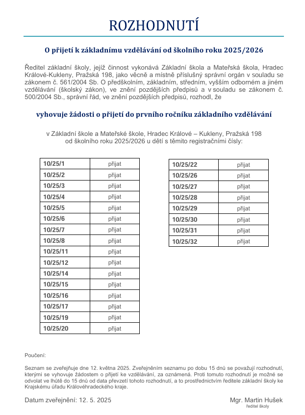 Rozhodnutí o přijetí k základnímu vzdělání od školního roku 2025/2026