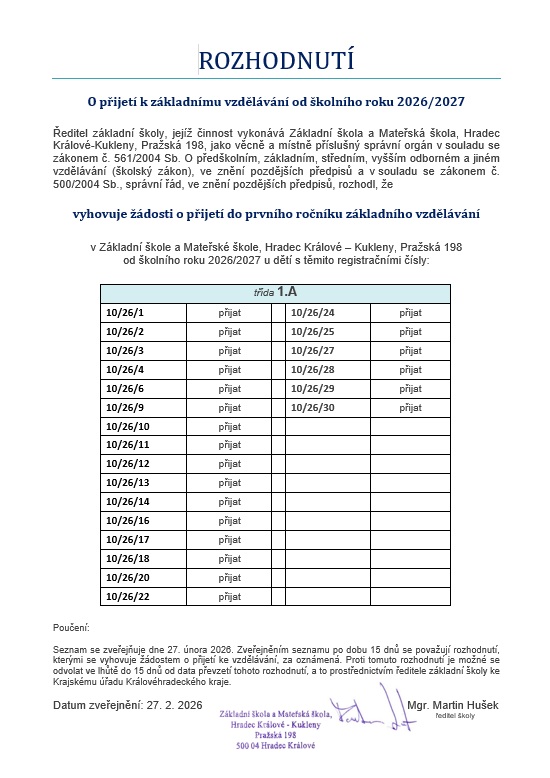 Rozhodnutí o přijetí k základnímu vzdělávání od školního roku 2026/2027