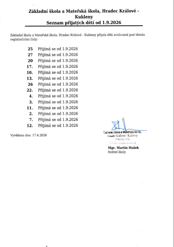 Seznam přijatých dětí MŠ Markova