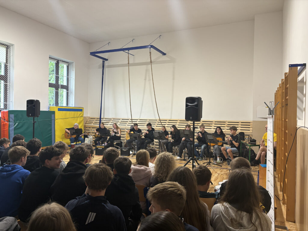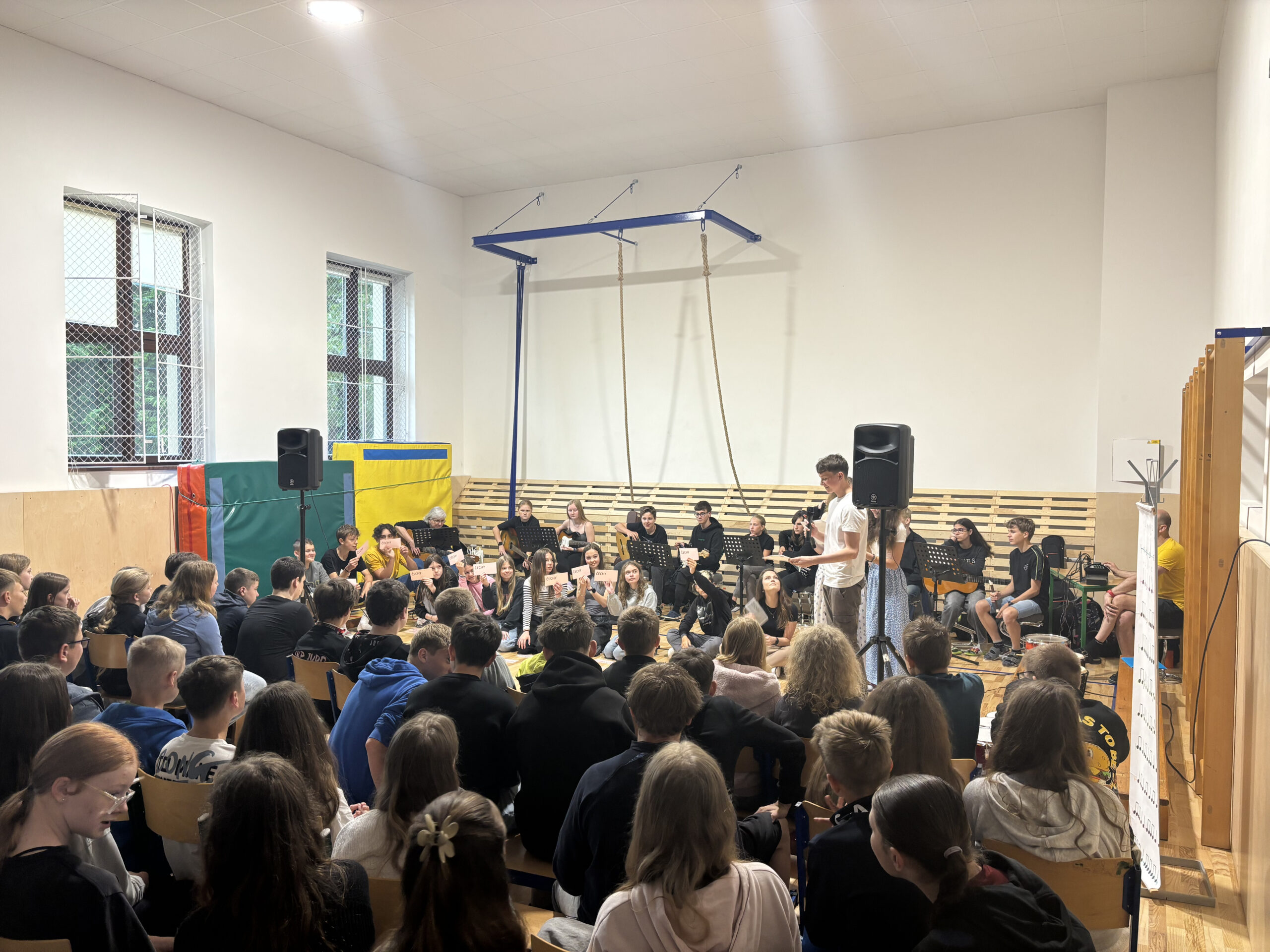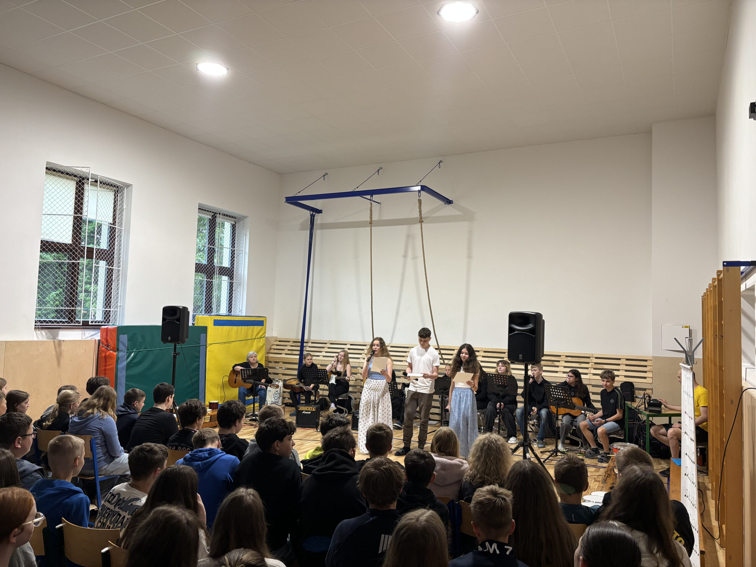 Členové hudebního kroužku a žáci 6.A pozvali ostatní ze druhého stupně na „mimořádnou hodinu hudební výchovy“ do malé tělocvičny. Tématem byly lidové a umělé písně a rytmické cvičení. Moderování se ujali Amélie Štěpánková, Nicol Krkonošková a Pavel Voborník z 9. tříd. Zvládli nejen koncert spolehlivě a zkušeně uvádět, ale také zorganizovat soutěž pro zájemce z řad diváků (žáků i učitelů). Přikládáme pár fotek a video se společným zpěvem.