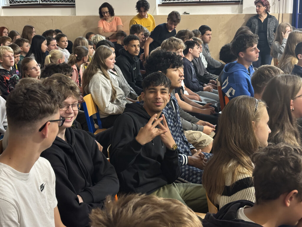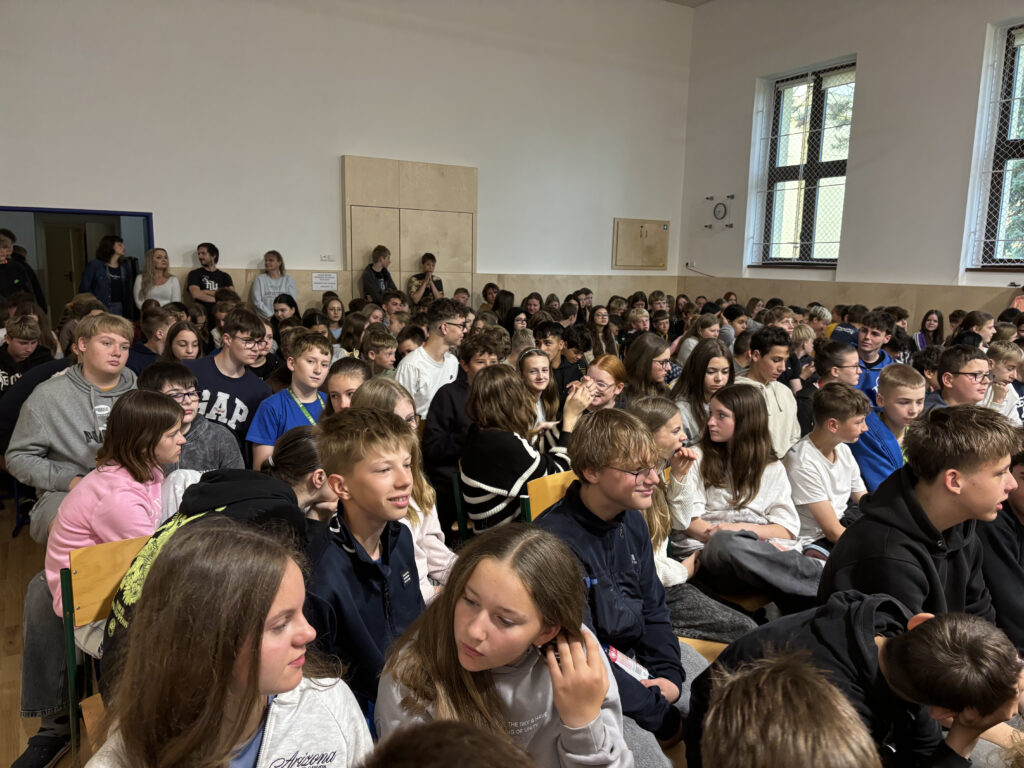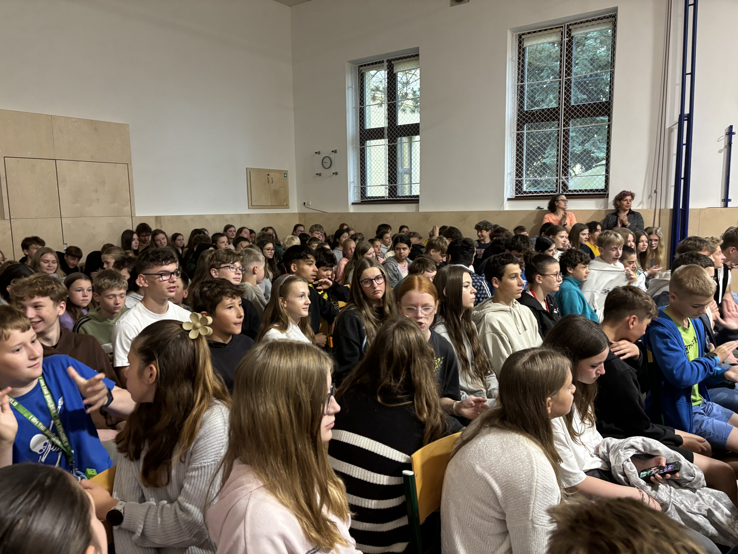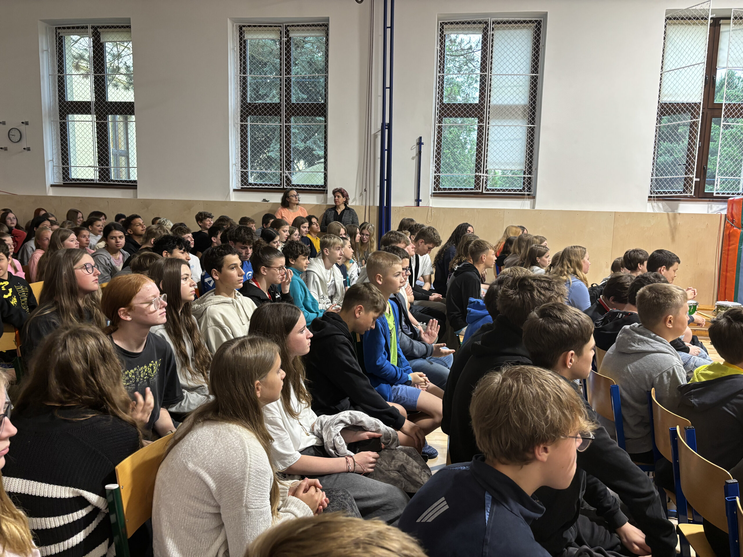 Členové hudebního kroužku a žáci 6.A pozvali ostatní ze druhého stupně na „mimořádnou hodinu hudební výchovy“ do malé tělocvičny. Tématem byly lidové a umělé písně a rytmické cvičení. Moderování se ujali Amélie Štěpánková, Nicol Krkonošková a Pavel Voborník z 9. tříd. Zvládli nejen koncert spolehlivě a zkušeně uvádět, ale také zorganizovat soutěž pro zájemce z řad diváků (žáků i učitelů). Přikládáme pár fotek a video se společným zpěvem.