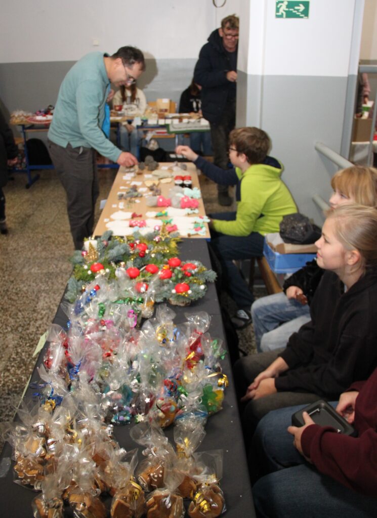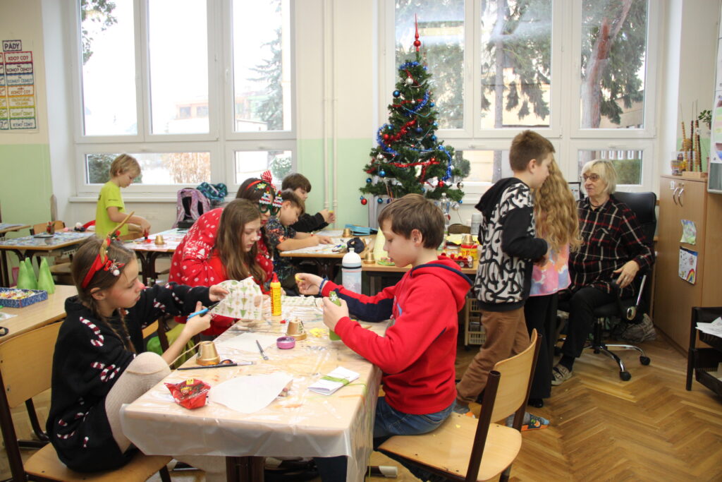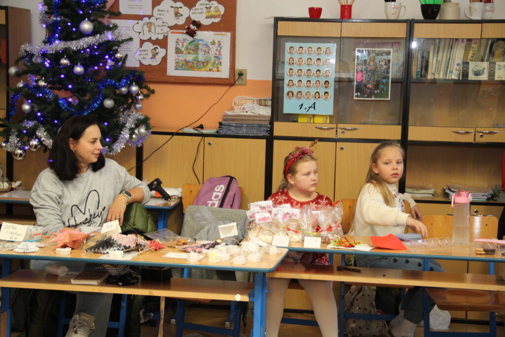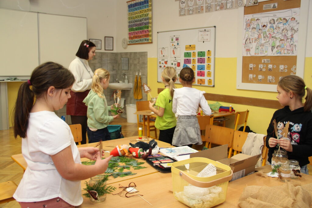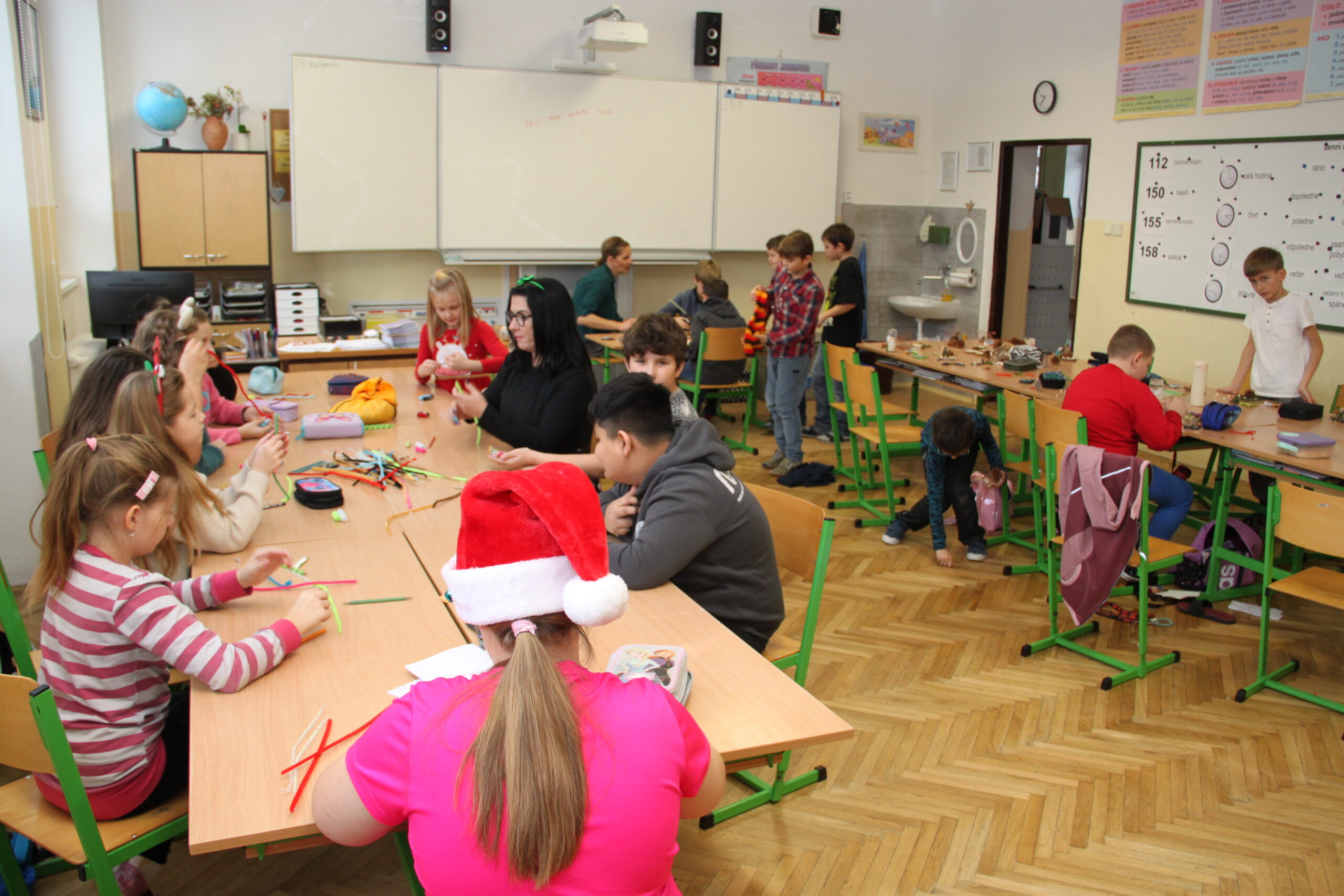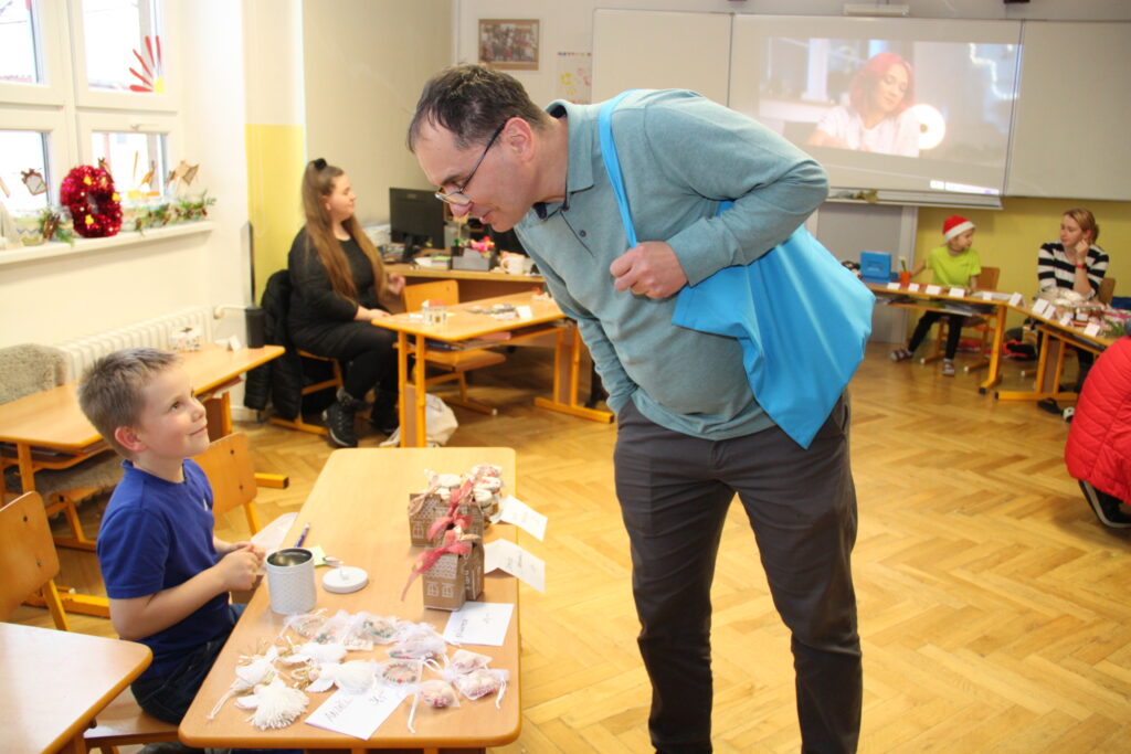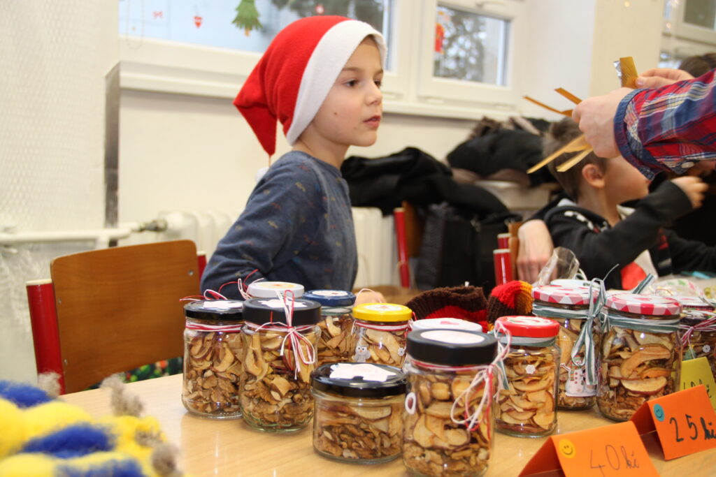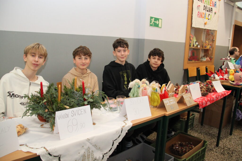 Dopoledne patřilo rukodělným aktivitám, kdy si žáci mohli vyzkoušet nejrůznější výtvarné techniky a vytvořit si drobné dárky či ozdoby. S potěšením jsme přivítali také děti z našich mateřských školek, které si u nás s pomocí starších spolužáků vyrobily svá vánoční přáníčka. Odpoledne následoval prodejní jarmark. Stánky zaplnily svícny, věnce, svíčky, sladké dobroty i drobné dárečky, které děti s pečlivostí a nadšením připravovaly i několik týdnů. Návštěvníci si navíc mohli pochutnat na výborné kávě v naší fairtradové kavárně. Prodej vlastních výtvorů je pro žáky každoročně velkou motivací. I letos se za podpory žákovského parlamentu rozhodli část ze svého výtěžku darovat na charitativní účely, čímž potvrdili smysl Vánoc a ukázali svou empatii a ochotu pomáhat.