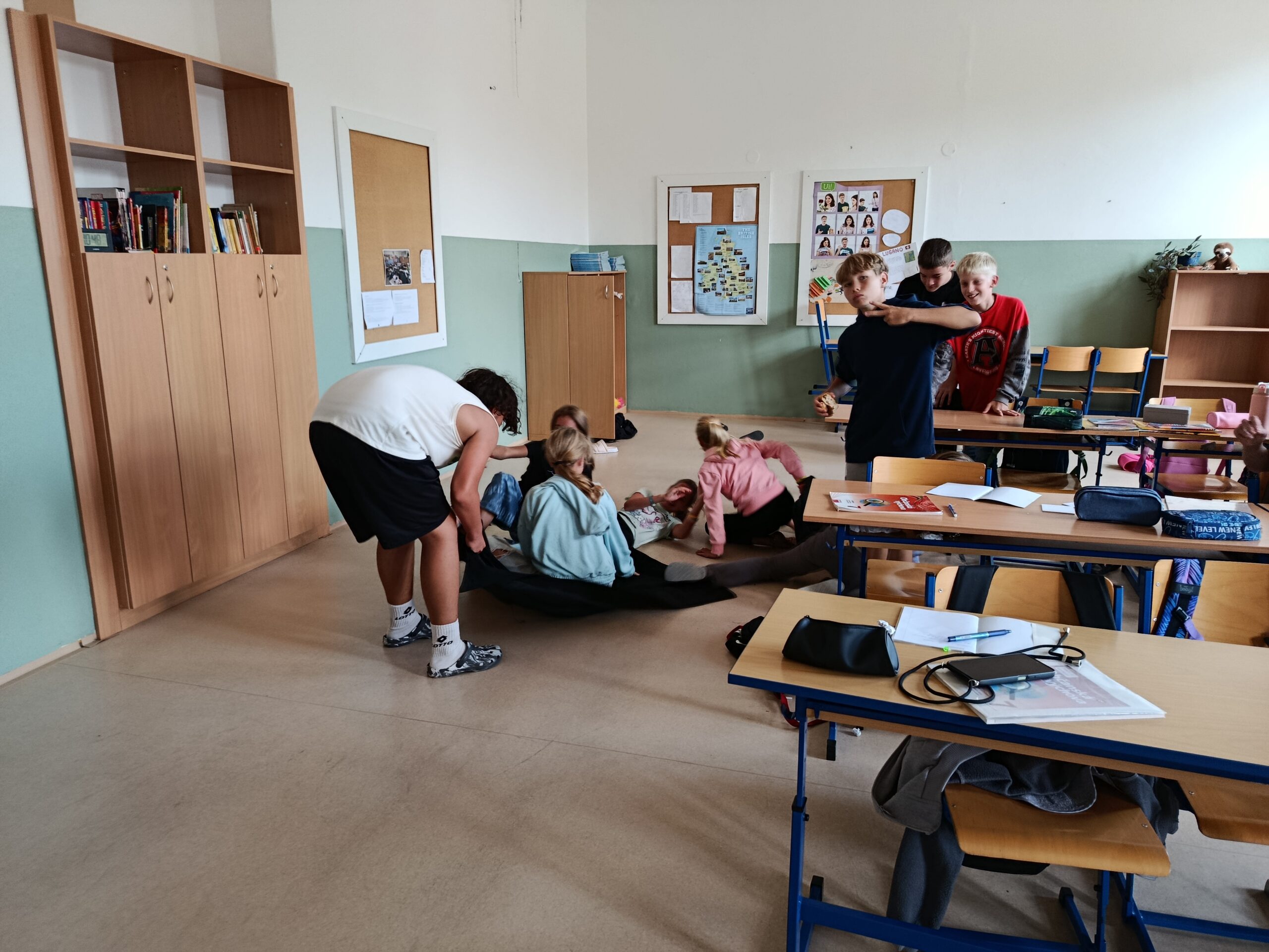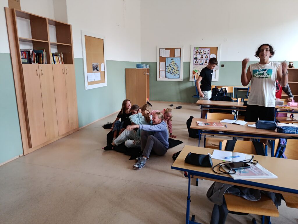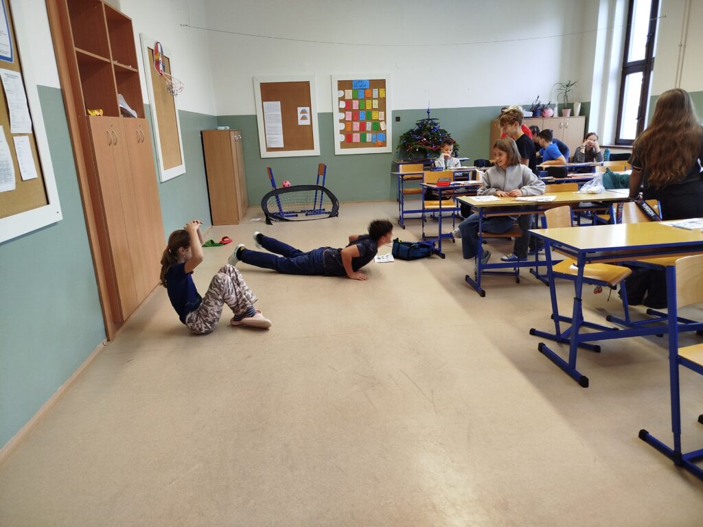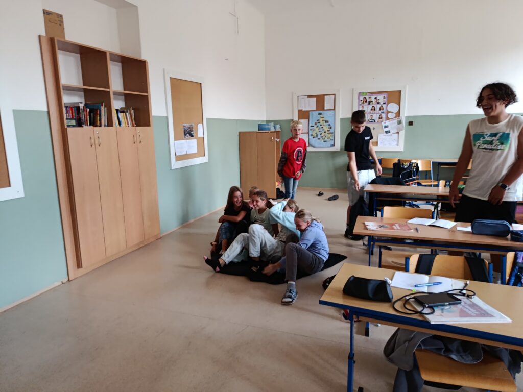 V úterý vyšlo skvělé počasí, a tak jsme se všichni radovali, jak si společně branný den užijeme. Rozdělili jsme se do tříčlenných týmů a závod mohl začít. Všichni jsme úspěšně zvládli všech pět stanovišť, na kterých jsme si připomněli například hlavní město ČR, práci s buzolou, přenos zraněného nebo volání na tísňové linky. Byl to prima zážitek! 🙂 🙂 🙂 Děkujeme deváťákům a paní učitelce Hápové!
